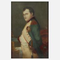 Anfang 20. Jh., unsigniert, auf Messingplakette bezeichnet Delaroche Napoleon, Gouache auf Platte, Kopie nach dem Original von Hippolyte (Paul) Delaroche, welches den französischen Kaiser als Halbfigur im Profil in seinem Arbeitszimmer zeigt, gekleidet in Uniform mit Auszeichnungen und Schärpe, den Blick dem Betrachter zugewandt, in breiter gekehlter Leiste gefasst, Falzmaße 18 x 14 cm, Gesamtmaße 30 x 25 cm.