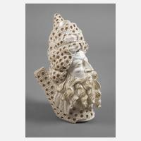 Ende 19. Jh., Laubholz massiv, dunkel gefasst und beschnitzt, Darstellung eines menschlichen Schädels mit eingesetzten Zahnreihen aus Bein, der Kiefer mittels Federmechanismus beweglich gelagert, Substanzverluste, H 25 cm.