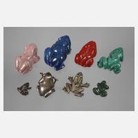 20. Jh., ungemarkt, in Form von Kröten und Fröschen gearbeitete Figuren aus Lapislazuli, Malachit, Moosachat und Rhodochrosit, dazu Korallschnitzerei sowie drei Exemplare aus Metallguss, Substanzverluste, Altersspuren, L max. 6 cm.