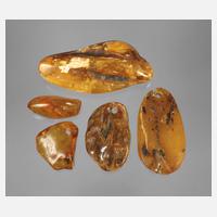 Alter unbestimmt, drei verschieden große Segmente von transluzider honiggelber Farbe, teils beschnitten und poliert, alle zeigen mannigfaltige Einschlüsse, ein Teil mit Rissbildung, L max. 13,5 cm, G ca. 326 g.