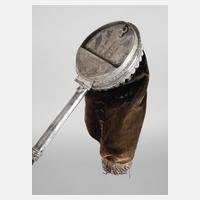 signiert Johann Martin Lunderstoedt und datiert 1729, in Niellotechnik verziertes Silberblech, kreisrundes Gehäuse mit schlankem Arm, staffiert mit Akanthusblättern, samtener Beutel mit angesetztem Glöckchen, Altersspuren, L 25 cm.