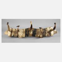 Anfang 20. Jh., bestehend aus Stuhl, Standascher und Rauchtisch, aus Rot- und Dammwildschaufeln gestaltete Kleinmöbel, der Stuhl mit gepolsterter Sitzfläche und Lehne, der Ascher mit Neusilbermontierung, der Tisch mit polygonal facettierter Rüsterplatte, fragmentarisch erhaltene Zigarrenschneider, Zigaretten- und Streichholzhalter, unterschiedliche Maße und Erhaltungen, H max. 100 cm.