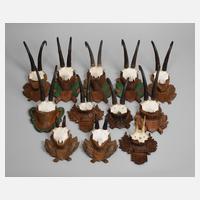 1. Hälfte 20. Jh., zwölf Stück, elf präparierte Gamsgehörne und ein Rehbock, auf mehrfarbig gefassten, teils beschnitzten Laubholzbrettern, unterschiedliche Maße und Erhaltung, H max. ca. 33 cm.