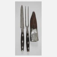 um 1800, dunkles Glattlederetui mit gravierter Eisenmontierung, zweiteiliges Besteckset, bestehend aus Messer und Gabel, Griffstücke aus Ebenholz, verziert von Metallrosetten, Alters- und Gebrauchsspuren, L 32 cm.