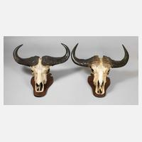 Anfang 20. Jh., präparierte Schädel zweier Wasserbüffel, auf massiven Hartholzbrettern montiert, leichte Erhaltungsmängel, H je ca. 70 cm.