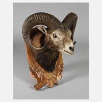 Mitte 20. Jh., komplett präpariertes Haupt eines Widders mit eingesetzten Glasaugen, auf beschnitztem Eichenholzbrett montiert, dieses mit Fehlstelle, sonst normale Altersspuren, H ca. 55 cm.