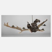 Mitte 20. Jh., aus Rot- und Damwildschaufeln gefertigter Lüster, an Gliederketten abgehängt, mit sechs aufgesetzten Tüllen, leichte Altersspuren, H 60 cm, D 100 cm.