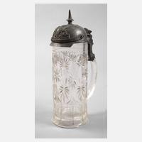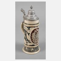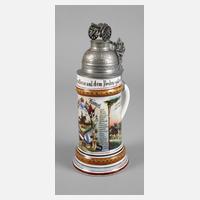 bezeichnet "1898 b.d.3. Esk. 5. Bayr. Chevaul. Rgt. Erzherz. Albr. v. Österr. Zweibrücken 1901", Namensangabe Reserv. Künzel, schauseitig Chevauleger mit Lanze zu Pferd, umrahmt von Fahnen und zwei Namensleisten, links und rechts Manöver und Abschiedsszene, Bodenlithophanie Wirtshausszene (mit Spinne), erhöhter Zinndeckel, als Abschluss eine Feldkanone, der Drücker als Löwe mit Wappenschild, guter Zustand, H max. 27 cm.