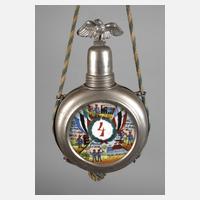 um 1910, ohne Bezeichnung, Glasflasche mit Metallmontur, schauseitig Reservistendekor, Kaiserkrone mit Schulterklappe, Kanonen, Säbeln, König Ludwig III. von Bayern und Umschrift „Parole Heimat, Andenken an meine Dienstzeit“, hinten ein Soldatenbild zwischen zwei Gewehrpatronen und Kaiserkrone, Schraubverschluss als Trinkbecher mit Adlerabschluss, blau-weiße Kordelschur mit zwei Quasten, guter Zustand, H max. 20 cm.