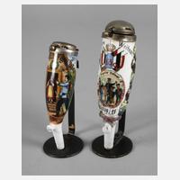 bezeichnet "Ersatz 1909/11. der 12. Cp. 5. Rh. Inftr. Rgt. N. 65. Cöln", Namensangabe Reserv. Weitner, schauseitig 65er Schulterklappe unter Krone, umrahmt von Fahnen, Trommeln und Trompeten, darunter Abschiedsszene, eingerahmt von stilisiertem Eichenlaub, hinten zwei Namensleisten, oben Metallmontur mit Deckel, H 15 cm; bezeichnet "K.K. Landw. Inf. Reg. Eger Nr. 6", Namensangabe Anton Rauner, 5. Kompanie, 2. Zug, schauseitig Heimkehrszene vor bäuerlichem Anwesen, oben Metallmontur mit Deckel, H 13 cm, beide im guten Zustand.