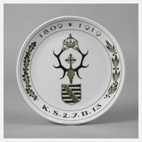 2. Königlich Sächsisches Jäger-Bataillon Nr. 13, 1809-1919, unterglasurblaue Schwertermarke 1934-1945, 1. Wahl, Präge- und Pinselnummern, Coupeform mit feiner grüner Unterglasurbemalung, Regimentsemblem mit sächsischen Wappen, Eichen- und Lorbeerlaub, Jubiläumsdaten und Umschrift, Wandaufhängung, guter Zustand, D 25,5 cm.