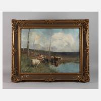 Frühlingslandschaft mit Kühen beim Trinken am bewachsenen Ufer eines Sees und im Hintergrund Bäuerin, idyllische Szenerie unter locker bewölktem Himmel, Mischtechnik (Pastell, Deckfarben und Aquarell), Ende 19. Jh., links unten signiert "MHagemans", etwas fleckig und angeschmutzt, hinter Glas im gestuckten und goldbronzierten Rahmen (etwas bestoßen), Falzmaße ca. 68,5 x 87,5 cm. Künstlerinfo: belgischer Maler und Aquarellist (1852 Lüttich bis 1917 Ixelles/Elsene), Spross einer Bankiersfamilie, ab 1873 autodidaktische Beschäftigung mit der Malerei, 1874 Bekanntschaft mit Félicien Rops, ließ sich in Anseremme in der Provinz Namur nieder, hier Freundschaft mit Périclès Pantazis, ging nach Brüssel und wurde Mitglied der Gruppe „Cercle des Aquarellistes et des Aquafortistes Belges“ und „Les Hydrophiles“, mehrere Reisen nach Skandinavien und Deutschland, ab 1886 in Ixelles ansässig, sein Sohn Paul Hagemans wurde ebenfalls Maler, u.a. Teilnahme an den Ausstellungen im Münchner Glaspalast zwischen 1890-99, Quelle: Thieme-Becker und Wikipedia.