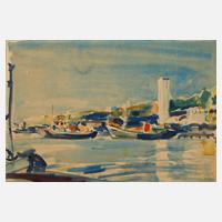 rasche Aquarellskizze eines Hafens, unten rechts schwer leserlich signiert und datiert "Georgi (19)69", Aquarellkarton, auf Karton doubliert, unten links Riss im Aquarellkarton, sonst gut erhalten, Falzmaße 29,5 x 41,5 cm. Künstlerinfo: eigentlich Curt Johannes Georgi, dt. Maler, Graphiker und Illustrator (1901 Dresden bis 1989 Malschendorf), 1915-22 Ausbildung am Fletcherschen Lehrerseminar in Dresden-Neustadt und Studium an der Kunstgewerbeschule Dresden, 1922-26 als Lehrer in Hermsdorf in der Sächsischen Schweiz tätig, 1926 Teilnahme an der Internationalen Kunstausstellung in Dresden, ab 1927 Mitglied im Deutschen Künstlerbund, 1928 Übersiedlung nach Sebnitz, 1926-31 Studium der Philosophie, Deutsch, Geschichte und Pädagogik an der Universität Leipzig, 1931 Promotion, 1931-33 Assistent an der Technischen Hochschule Dresden, 1933-39 Lehrer in Sebnitz, 1939 zum Kriegsdienst eingezogen, ab 1940 wieder als Lehrer tätig, 1941-45 in der Lehrerausbildung in Bischofswerda, ab 1945 freischaffend in Sebnitz, ab 1927 Mitglied im Deutschen Künstlerbund Weimar und seit 1952 Mitglied im Verband Bildender Künstler (VBK) der DDR, es folgten zahlreiche Studienreisen, unter anderem Hamburg, München, Riesengebirge, Italien und Schweiz, tätig in Sebnitz, zeitweise in Leipzig und Zwickau, Quelle: Vollmer, Saur "Bio-Bibliographisches Künstlerlexikon", Dressler, Eisold „Künstler in der DDR“, Bildatlas "Kunst in der DDR" und Wikipedia.