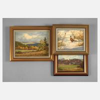 Ansicht von Jößnitz mit Schloss, hügelige Vogtlandlandschaft und Fasanenpaar im Schnee, signiert, 2 x datiert (19)89, Öl auf Malkarton, gerahmt, Falzmaße 13 x 18 cm, 14 x 17 cm und 17,5 x 23 cm. Künstlerinfo: dt. Tier-, Jagd- und Landschaftsmaler sowie Illustrator (1923 Plauen bis 1997 Plauen), studierte 1937-41 an der Plauener Kunstschule bei Walther Löbering und Kurt Geipel, ab 1945 freischaffend, Mitglied im Verband Bildender Künstler (VBK) der DDR, tätig in Plauen-Kauschwitz, Quelle: Vollmer, Eisold “ Künstler in der DDR”, Frank Weiß "Malerei im Vogtland" und Wikipedia.