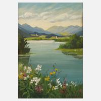 Blick über blühende Wiesenblumen, über den romantisch gelegenen Flusslauf des Inn, auf die Voralpenlandschaft mit zwei Kirchen, Öl auf Malkarton, rechts unten signiert, rückseitig bezeichnet und nummeriert 221, um 1960, Karton wellig, leicht stockfleckig, Falzmaße 32,5 x 23 cm. Künstlerinfo: eigentlich Hermine Herzing, genannt: „Blumenminni“, dt. Malerin, Radiererin, Porzellanmalerin und Illustratorin (1883 Frankfurt am Main bis 1968 Karl-Marx-Stadt), erster Unterricht beim Vater in Malerei und Lithographie, studierte an der Akademie Hanau, zunächst tätig als Entwurfszeichnerin für Stickereien und Handarbeiten, 1910-34 in Dresden, hier Schülerin von Georg Hermann Gelbke und Willy Kriegel, ab 1934 tätig in Chemnitz (Karl-Marx-Stadt), Quelle: Vollmer und Wikipedia.