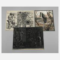 nächtliche Landschaft mit zwei Satyren und Weinflasche, einmal als Mischtechnik und ein Blatt als Federzeichnung, auf einem Ast sitzender Marabu vor Flusslandschaft, Mischtechnik, um 1940, zwei Arbeiten signiert "F. Heynig", teils leichte Altersspuren, Blattmaße max. ca. 27 x 36 cm. Künstlerinfo: dt. Maler, Graphiker und Illustrator (1888 Borna bis 1950 Wiesbaden), 1898 Umzug nach Leipzig-Stötteritz, ab 1903 Studium an der Akademie Leipzig und Schüler von Bruno Heroux und Hugo Steiner-Prag, später hier Dozent für Tierzeichnung, ab 1920 Nebenwohnsitz in Wolftitz bei Frohburg, tätig zunächst in Leipzig, ab den 1940er Jahren in Wiesbaden, Quelle: Internet.