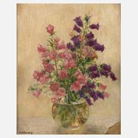 duftiges Blumenarrangement vor lichtem Grund, hierzu bemerkt Frank Weiß: "... Walter Löhner war ein hochbegabter Autodidakt, der mit feinem Gespür Stimmungen erfassen und, ausgestattet mit einem ausgeprägten Farben- und Formensinn, ins Bild einfangen konnte. Seine Gemälde, die sich in impressionistischer Weise aus kleinen Farbtupfen und -strichen zusammensetzen, welche sich im Auge des Betrachters vermischen und Form werden, feiern im Widerschein von Licht und Farbe die Wunder des Alltäglichen in der Schöpfung. ...", dünn lasierende, partiell minimal pastose Malerei, Öl auf Hartfaser, datiert 1941, links unten signiert, schön gerahmt, Falzmaße ca. 66 x 54 cm. Künstlerinfo: dt. Maler (1899 Reichenbach bis 1968 Rodewisch), künstlerisch Autodidakt, zeitweise als Hafenarbeiter in Hamburg tätig, 1933-45 wegen Ablehnung von Arbeitsverpflichtung und kritischen Äußerungen zeitweilig inhaftiert, nach 1945 weiter unangepasst, tätig in Reichenbach und später in Mylau, starb verarmt und nervlich zerrüttet in der Psychiatrie Rodewisch, Quelle: Frank Weiß „Malerei im Vogtland“ und Info seines Schülers Fredo Bley.