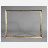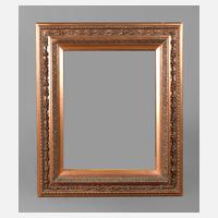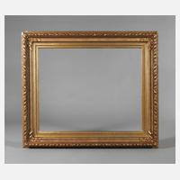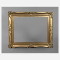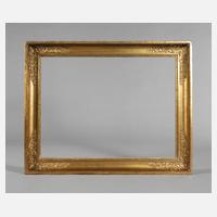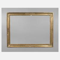 Mitte 19. Jh., ca. 13 cm breiter, aufsteigend profilierter, gestuckter und goldbronzierter Rahmen mit tiefer Hohlkehle, Eckkartuschen und umlaufende Blütenranke, Gehrung geschnitten und über Eck gearbeitet, verplatteter Blindrahmen, Ecken gerissen, kleinere Fehlstellen, Falzmaße ca. 18 x 21,5 cm.