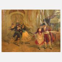 ca. 6 cm breiter, aufsteigend profilierter Holzrahmen mit eingesetzten Ecken, verziert mit vergoldeter Blattornamentik, rückseitig verzapfter Blendrahmen, altersgemäße Erhaltung mit Gebrauchsspuren, Falzmaße ca. 53,5 x 41 cm.