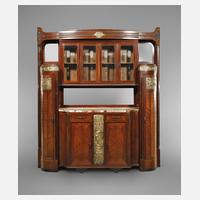 Entwurf Heinrich Vogeler um 1910, Ausführung Worpsweder Werkstätte Franz Vogeler/Tarmstedt bei Bremen, Eiche massiv, dunkelbraun gebeizt, Schrank mit zweitürigem Unterteil, innen Regalboden und zwei Schubkästen, Aufsatz mit Regalböden, getragen von massiven schräggerippten Vollsäulen, Front verziert mit stilisierten Floralmotiven in Oberflächenschnitzerei, schmiedeeiserne Türbeschläge, Oberfläche nachträglich gebeizt, Alters- und Gebrauchsspuren, Maße Schrank 196 x 150 x 61 cm. Quelle: Schleswig-Holsteinisches Landesmuseum: Jugendstil, S. 98, Abb. 102, dort Abbildung eines zu diesem Möbel gehörenden Eckschrankes.