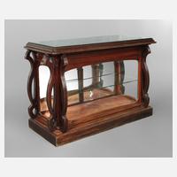 wohl Wien, um 1905, Gestell aus massivem Nussbaum, rotbraun gebeizt, Zierbeschläge aus Messing, die Scheiben mit Facettschliff, allseitig zum Öffnen, auf Rollen gelagert, alt restauriert, mit Gebrauchsspuren, Maße 77 x 60 x 51 cm.