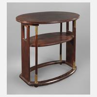 um 1910, Eiche massiv, braun gebeizt, ovale Platte getragen von vier gedrechselten Vollsäulen, mit Messingmanschetten verziert, restauriert, Maße 61 x 75 x 39 cm.