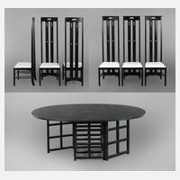 Modell Ingram, Stühle in der Zarge gemarkt APS Denmark, Reedition, 2. Hälfte 20. Jh., bestehend aus sechs Hochlehnstühlen und ovalem Esstisch, in der Zarge gestempelt, Esche massiv, schwarz gebeizt, Sitzbezüge aus beigefarbenem Leder, dazu großer ovaler Esstisch mit ausklappbaren Seitenwangen, auf kreuzverstrebtem Gestell, sehr guter Zustand, Maße Tisch 76 x 180 x 125 cm, Maße Stühle H je 151 cm, SH je 42 cm.