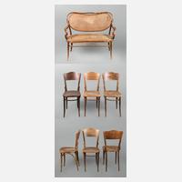um 1900-1910, bestehend aus einer Bank und sechs Stühlen, Buchenbugholz braun gebeizt, Korbgeflecht der Bank restauriert, Verschraubung der Stühle erneuert, Oberfläche mit stärkeren Alters- und Gebrauchsspuren, Maße Bank 98 x 115 x 52 cm, Maße Stuhl H je 91 cm, SH je 47 cm.