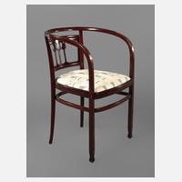 Modell Nr. 721, Entwurf um 1902, Ausführung J&J Kohn Teschen Austria, Zarge mit Brandstempel und Klebeetikett, Buchenbugholz rotbraun gebeizt, wohnfertig restauriert, Bezug erneuert, Maße 81 x 55 x 50 cm.