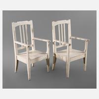 um 1910, Zarge mit Brandstempel und Klebeetikett Thonet Wien, Buchenbugholz rotbraun gebeizt, die Lehne mit geometrischer Intarsie verziert, Sitzgeflecht teilweise erneuert, guter Zustand, mit Gebrauchsspuren, H je 103 cm, SH je 47 cm.
