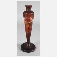 um 1900, signiert, farbloses Glas, partiell gelb unterfangen, rotbrauner Überfang, hochgeätzt und fein poliert, herausgearbeitete Berglandschaft mit blühenden Bäumen im Vordergrund, hohl gearbeitet, im Fuß eine Öffnung für das Kabel, herstellungsbedingt eine Schliere und winzigste Spannungsrisse, guter Zustand mit geringen Altersspuren, H 37 cm.