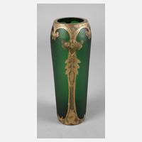 Verreries de Saint Denis Paris, um 1900, im ausgekugelten Abriss goldener Stempel, flaschengrünes Glas, eisglasartig geätzte Oberfläche, begrenzt durch vertikale, florale Bänder mit Lorbeerlaub und Dolden, vergoldet, graviert und teilpoliert, guter altersgerechter Zustand, H 26 cm.