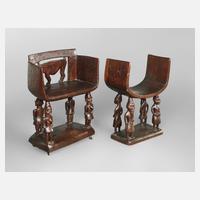 Benin, 20. Jh., dunkles schweres Hartholz beschnitzt, langrechteckige flache Basen mit je vier Beinen in Form plastisch gearbeiteter weiblicher Gestalten, auf ihren Häuptern eine u-förmig geschwungene Sitzfläche tragend, eine mit zusätzlicher Rückenlehne mit durchbrochenem Leopardenmotiv, gute Erhaltung mit leichten Altersspuren, H 78 und 72 cm.