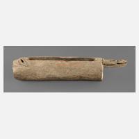 Ramu-Tal/Sepik-Gebiet, 1. Hälfte 20. Jh., Hartholz geschnitzt, aus einem Stamm gefertigte traditionelle Schlitztrommel mit aufwendigem ornamentalen Ritzdekor sowie figürlich gestaltetem Griffstück, sakrales Instrument, welches in der zeremoniellen Musik Neuguineas zur Übermittlung von Nachrichten und zur Begleitung von traditionellen Liedern und Tänzen geschlagen wird, Altersspuren, beigegeben Beleg der Galerie Philippe Dodier Avranches, L 150 cm.