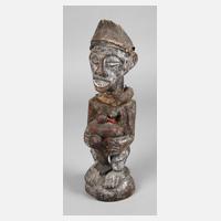 der Volksgruppe der Yombe zugeordnet, Kongo, 1. Hälfte 20. Jh., dunkles Hartholz, beschnitzt, teils farbig gefasst und mit eingesetzten Partien aus Klarglas, tatauiert, kniende weibliche Figur mit zwei Kindern, das Haar kunstvoll gebunden und von Schlangenhaupt bekrönt, trocknungsrissig, H 36 cm.