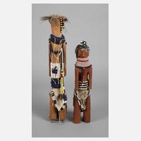 Kamerun, 20. Jh., Laubholz beschnitzt, teils farbig gefasst, schlanke abstrahierte Figuren mit reichem polychromen Perlbehang, kleinere Substanzverluste, H 35 und 44 cm.