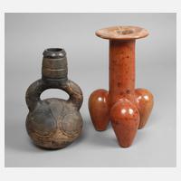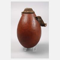 unbestimmten Alters, Kürbiskorpus mit aufgesetztem Stopfen aus geflochtenen Pflanzenfasern, Lederriemen, gefüllt mit verschiedenen Zähnen und Perlen sowie weiterem Utensil, Riemen defekt, Altersspuren, H 18 cm.