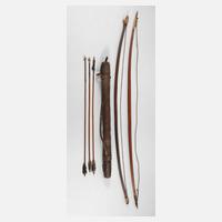 20. Jh., gebogtes, bräunlich gefasstes Hartholz, Textilwicklung, Tiersehne, zylindrischer Köcher aus Leder mit drei Pfeilen, diese mit Eisenspitzen und Federbesatz, Altersspuren, L max. 135 cm.