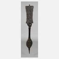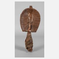 der Volksgruppe der Luba zugeordnet, Zentralafrika, 20. Jh., dunkles schweres Tropenholz, aufwendig beschnitzt, verziert von getriebenen Metallmontierungen, paddelförmig gestaltetes Ritualobjekt mit schlichtem Griffstück, dieses bekrönt von vollplastisch gearbeitetem weiblichen Haupt, hochrechteckiger oberer sowie tropfenförmig verlaufender unterer Abschluss ornamental staffiert, nicht ganz komplett, leichte Altersspuren, H 72 cm.