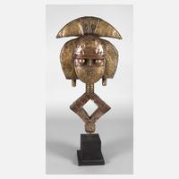 der Volksgruppe der Teke zugeordnet, Kongo, 20. Jh., Holz geschnitzt, dunkel gefasst, klassische männliche Fetischfigur mit angedeutetem stilisierten Kinnbart, helmartiger Bekrönung mit Haarkamm und linienförmigen Narbentatauierungen über große Teile des Gesichts, der Torso mit eingelassener rechteckiger und rot abgesetzter Öffnung, kleinere Substanzverluste, Altersspuren, H 40 cm. Info: die Teke schnitzten unterschiedliche Arten von Zauberfiguren, die mit diversen magischen Substanzen versehen wurden, welche unterschiedlichsten Funktionen inne hatten.
