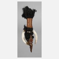 wohl Westafrika, 20. Jh., mit Naturfasern gebundenes Ritualobjekt aus Echthaar, hölzerner Schnitzmaske, Muschelschale und Warzenschweinhauer, Altersspuren, H ca. 20 cm.
