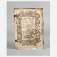 Aec non poetae accutissimi. Opus tragoedia aptissimisq figuris excultum. In quo tria millia errata atq inuersa loca. ad veterem lectione nunc primu reformata. Cu expositoribus luc., Venetiis, per Bernardinum de Vianis de Lexona, 1522, Format 4°, dreispaltig,140 Bl., Holzschnitt-Titelblatt, zahlreiche geschnittene Versaillen und je Kapitel eine Holzschnittillustration im Text, Einband fehlt, einige Blätter nahe Vor- und Nachsatz lädiert, Altersspuren, restaurierungsbedürftig.