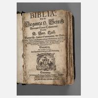 Biblia, das ist die ganze H. Schrift alten und neuen Testaments [...] Sampt D. Hütteri Summarien [...], Wittenberg in Verlegung Balthasar-Christoph Wustens 1661, Format Gr. 8°, illustriert mit Kupferstichen und Karten, in Ganzledereinband der Zeit, Holzdeckel, Schließen fehlen, Buchblock gebrochen, restaurierungsbedürftig.