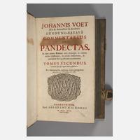 in Academia Lugduno-Batava, Johannis Voet, Commentarius Ad Pandectas, In quo praeter Romani juris principia ac controversias illustriores, jus etiam hodiernum, & praecipuae fori quaestiones excutiuntur, Tomus Secundus, Hagae-Comitum apud Abrahamum de Hondt 1716, Format 4°, 1180 S., [34] Bl., Titelblatt mit Holzschnittvignette, Farbschnitt, Schweinsledereinband der Zeit mit Holzdeckeln und reicher Blindprägung, punzierte und gravierte Messingschließen, davon eine fehlend, die andere an angeschnittenem Lederriemen, Titelblatt mit handschriftlichem Besitzervermerk und poröser Stelle, Alters- und Gebrauchsspuren.