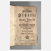 von Thüringen, Meissen und Sachsen, welche der sächsische Patriot aus den bewährtesten Nachrichten in XI Stücken der studirenden Jugend in möglichster Kürze aufrichtig erzählet, von M. Michael Ranst, Leipzig bey Carl Wilhelm Holle 1770-1773, Format Kl. 8°, [6] Bl., 800/322 S., [37] Bl. Register, Rotschnitt, Halbpergamenteinband der Zeit mit Pappdeckeln und handschr. bezeichnetem Rücken, Einband restaurierungsbedürftig, handschriftliche Vermerke in Tinte und Graphit, Alters- und Studierspuren.