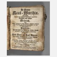 voorgestellt in einem mit zerschidenen Persohnen angestellten Geistlichen auch lustigen Gespräch, von denen besonders in denen Würths-Häuseren nothwendigen Tugenden, und zuvermeidenten Lasteren, wie auch schändlichen Gewohnheiten, nebst beygefügten Unterricht, wie man unter der Arbeit das Leyden Christi betrachten, auch eine nutzliche Haußhaltung anordnen könne [...], verfasset von einem Ordens-Geistlichen des Marianischen Praemonstratenser-Ordens, Augspurg zu finden in der Bencardischen Handlung 1745, Format 8°, [4] Bl., 329 S., [2] Bl., Ganzpergamenteinband der Zeit mit ornamentaler Prägung, Holzdeckel, Überreste zweier Schließen, Buchblock gebrochen, Alters- und Studierspuren.