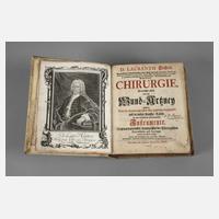 D. Laurentii Heisters, Braunschweig-Lüneburgischer Hof-Rath und Leib-Medicus [...], Chirurgie, in welcher alles, was zur Wund-Artzney gehöret, nach der neuesten und besten Art, gründlich abgehandelt, und in vielen Kupffer-Tafeln die neu-erfundene und dienlichste Instrumente, nebst den bequemsten Handgriffen der Chirurgischen Operationen und Bandagen deutlich vorgestellet werden, vierte viel vermehrte und verbesserte Auflage, Nürnberg bey Johann Steins seel. Wittib 1743, Format Gr. 8°, Kupferfrontispiz mit Portraitdarstellung des Autors, zweifarbig gedrucktes Titelblatt, [7] Bl., 1078 S., [11] Bl., alle 38 Kupferfalttafeln vorhanden, Rotschnitt, Pergamenteinband der Zeit, altersgemäß schöne Erhaltung mit vereinzelt geringen Mängeln.