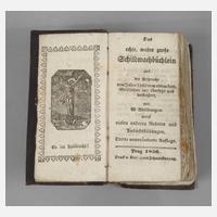 Das echte, wahre, große Schildwachbüchlein, aus der Ursprache vom Jahre 1560 von einem kath. Geistlichen neu übersetzt und verbessert, mit 48 Abbildungen nebst vielen anderen Gebeten und Andachtsübungen, dritte unveränderte Auflage, Prag bei Johann Spurny 1856, Format 12°, 426 S., [3] Bl. (Inhaltsverzeichnis), im Text zahlreiche Holzstiche religiöser Szenen, Hadernpapier, Farbschnitt, schlicht geprägter Ganzledereinband der Zeit, Blätter stellenweise etwas fleckig und mit ausgefransten Rändern, insgesamt normale Alters- und Studierspuren, unkollationiert.