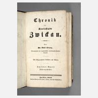 von Dr. Emil Herzog, zweiter Theil Jahresgeschichte, Zwickau bei R. Zückler 1845, Format 8°, [3] Bl., 937 S., mit mehreren lithografierten Plänen und Ansichten, Halbledereinband der Zeit, Rücken alt repariert, Deckel berieben, Buchblock zwischen S. 4 und 5 gebrochen, Alters- und Studierspuren.