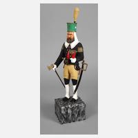 Schneeberg, 2. Hälfte 20. Jh., Holz geschnitzt und polychrom bemalt, auf rechteckigem Felsensockel detailreiche Darstellung eines sächsischen Bergmanns in Paradeuniform mit Schachthut, Tscherpertasche und abgehängtem Säbel sowie steckbarem Häckel und einer Kerzentülle mit Tropfschale aus Blech, diese mit Wachsspuren, sonst sehr guter Zustand, H 53 cm.